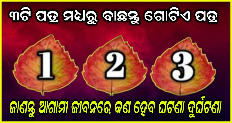 ଆମେ ଆପଣଙ୍କୁ ତିନି ରଙ୍ଗ ର ପତ୍ର ଦେଖାଉଛୁ ଏହା ମଧ୍ୟରୁ ଆପଣ ଏକ ରଙ୍ଗ ବାଛନ୍ତୁ ଓ ଜାଣନ୍ତୁ କି କେଉଁ ଭଳି ସମୟ ଆଗକୁ ଯାଇକି ପାଇବା ପାଇଁ ଯାଉଛନ୍ତି। ଆପଣ ନିଜ ମନ ପସନ୍ଦର ରଙ୍ଗ ବାଛନ୍ତୁ ତେବେ ଯାଇକି ଆପଣ ଭଲ ପରିଣାମ ପାଇବେ।
