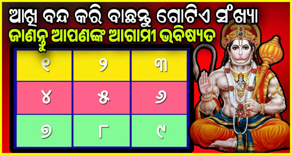 ନମସ୍କାର ପାଠକ ବନ୍ଧୁଗଣ। ବନ୍ଧୁଗଣ ଆମେ ଆପଣଙ୍କ ପାଇଁ ନେଇ ଆସିଛୁ ୧ରୁ ୯ ସଂଖ୍ୟା। ଧ୍ୟାନ ରଖିବେ ଆପଣ ସଂଖ୍ୟା ବାଛିବା ସମୟରେ ଭଗବାନ ହନୁମାନ ଙ୍କ ନାମ ନିଅନ୍ତୁ। ଆଖି ବନ୍ଦ କରି ହାତ ର ତର୍ଜନୀ ଆଙ୍ଗୁଠି ରଖିକି ବାଛନ୍ତୁ। ଏହା ପରେ ଆପଣ ନିଜର ଭବିଷ୍ୟତ ଜାଣି ପାରିବେ। ଆଖି ବନ୍ଦ କରି କୌଣସି ଗୋଟେ ସଂଖ୍ୟା ବାଛନ୍ତୁ ଓ ଜାଣନ୍ତୁ ଆପଣଙ୍କ ଭାଗ୍ୟ।