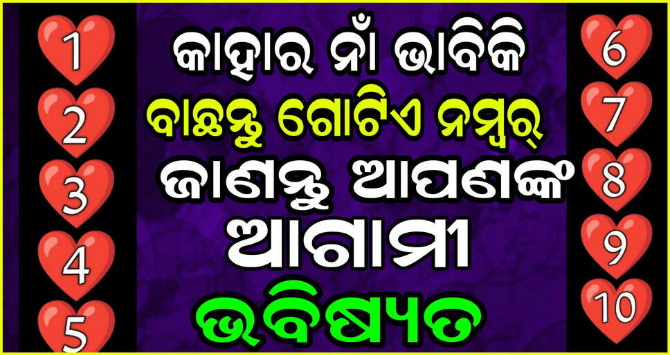 ଆପଣମାନେ ସମସ୍ତେ ଏହି ଭିଡିଓ ମାଧ୍ୟମରେ କାହାର ନାଁ ଭାବି ଗୋଟିଏ ନମ୍ୱର ବାଛନ୍ତୁ ଆଉ ଏହି ନମ୍ବର ଦ୍ଵାରା ଅନେକ କିଛି ଜାଣିପାରନ୍ତୁ । ଗୋଟିଏ ପୁଅ ଅନେକ ଝିଅଙ୍କ ଭିତରୁ ଗୋଟିଏ ଝିଅକୁ ଦେଖି ତା ମନରେ ଅନେକ କଥା ଭବିଥାଏ । ସେମାନେ ତାଙ୍କ ମନରେ ଅନେକ ଆଶା ରଖିଥାନ୍ତି ।