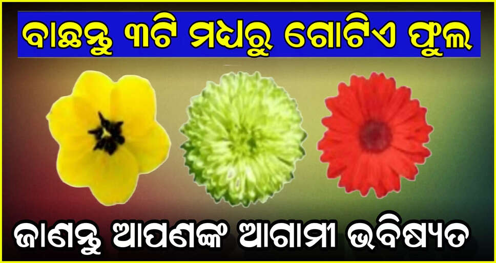 ଆପଣ ଏହି ଭିଡିଓରେ ଦେଇଥିବା ତିନୋଟି ଫୁଲ ଭିତରୁ ଗୋଟିଏ ଫୁଲ ବାଛନ୍ତୁ ଆଉ ଏହି ଫୁଲ ଅନୁସାରେ ଆପଣମାନେ ଆପଣଙ୍କ ଭବିଷ୍ୟତ ବିଷୟରେ ଜାଣିପାରିବେ । ଏବେ ଏହି ଭିଡିଓରେ ଦେଇଥିବା ତିନୋଟି ଫୁଲ ହେଉଛି, ହଳଦିଆ ରଙ୍ଗର ଫୁଲ, ନାଲି ରଙ୍ଗର ଫୁଲ ଏବଂ ସବୁଜ ରଙ୍ଗର ଫୁଲ ।