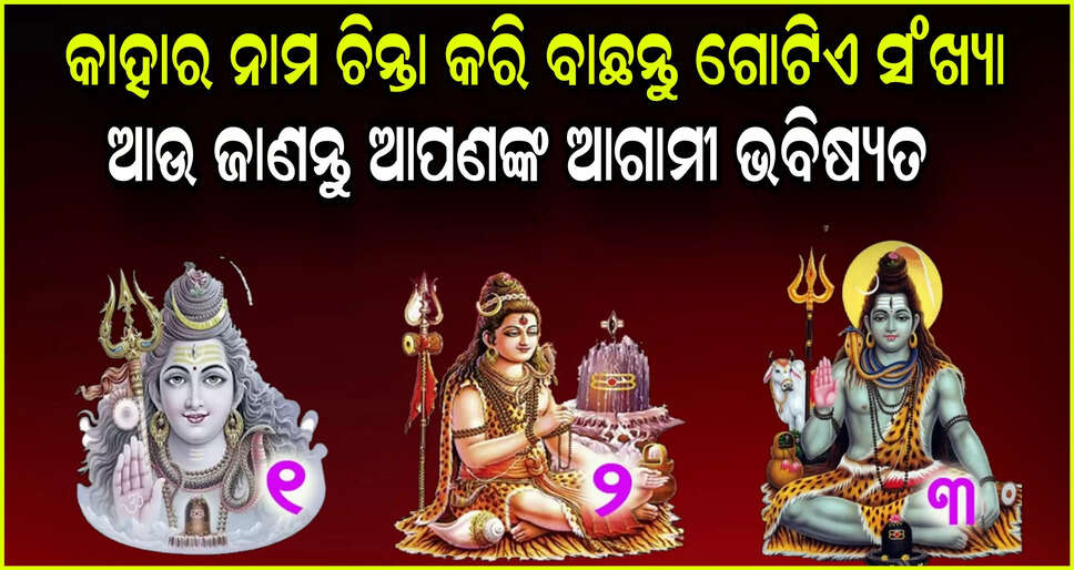 ନମସ୍କାର ବନ୍ଧୁଗଣ। ବନ୍ଧୁଗଣ ଆପଣଙ୍କ ପାଇଁ ନେଇ ଆସିଛୁ ୩ଟି ଶିବ ଠାକୁରଙ୍କ ଚିତ୍ର। ଏହି ତିନି ଠାକୁରଙ୍କ ମଧ୍ୟରୁ ଆପଣଙ୍କୁ ଯେ କୌଣସି ଗୋଟେ ବାଛିବାକୁ ହେବ। ଏହା ପରେ ଆପଣ ନିଜର ମନର ଇଚ୍ଛା ଓ ଭବିଷ୍ୟତ ବିଷୟରେ ଜାଣି ପାରିବେ।
