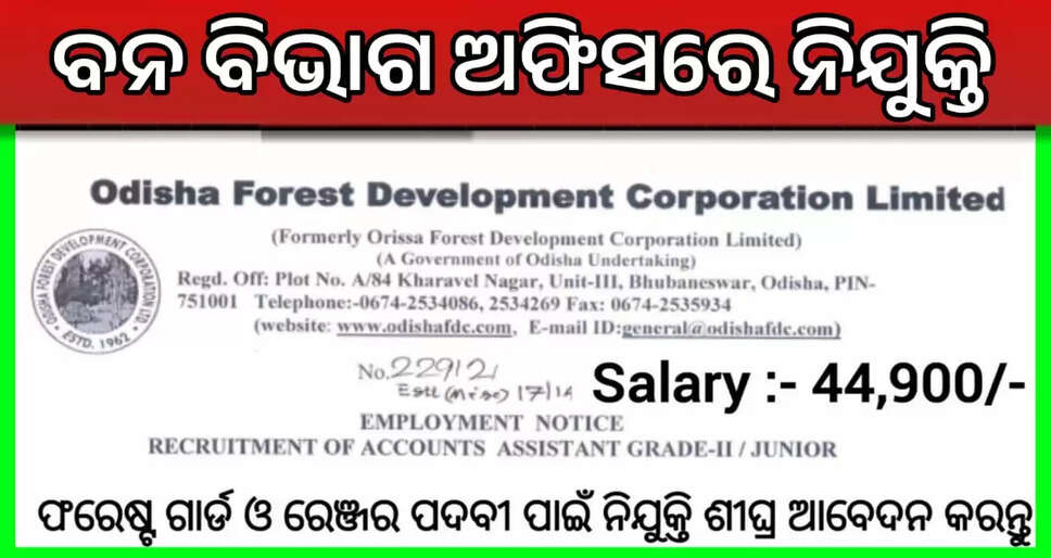 ଓଡ଼ିଶା ଫରେଷ୍ଟ ଡିପାର୍ଟମେଣ୍ଟ ତରଫରୁ ଆସିଅଛି।ଏଥିରେ ଓଡିଶା ର ସମସ୍ତ ଜିଲ୍ଲାର ପିଲାମାନେ ଆପ୍ଲାଏ କରିପାରିବେ।ଉଭୟ ପୁରୁଷ ଓ ମହିଳା ମାନେ ମଧ୍ୟ ଏହି ପୋଷ୍ଟ ଆପ୍ଲାଏ କରିପାରିବେ।