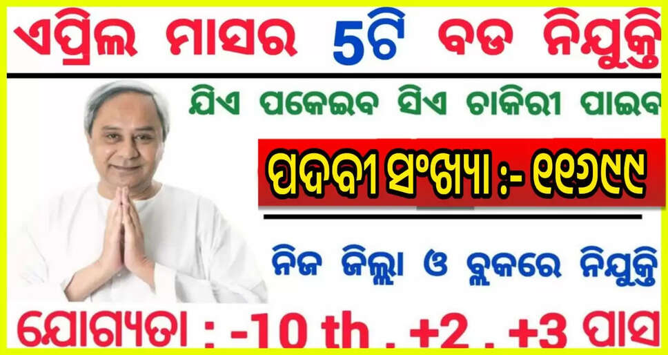 ଏପ୍ରିଲ ମାସରେ ୫ ଟି ବହୁତ ବଡ଼ ନିଯୁକ୍ତି ଆସିଅଛି। ଯଦି ଆପଣମାନେ ଦଶମ,ଯୁକ୍ତ ଦୁଇ,ଯୁକ୍ତ ତିନି ପାସ କରିଥିବେ ତେବେ ଏହି ପୋଷ୍ଟ ଆପ୍ଲାଏ କରିପାରିବେ।
